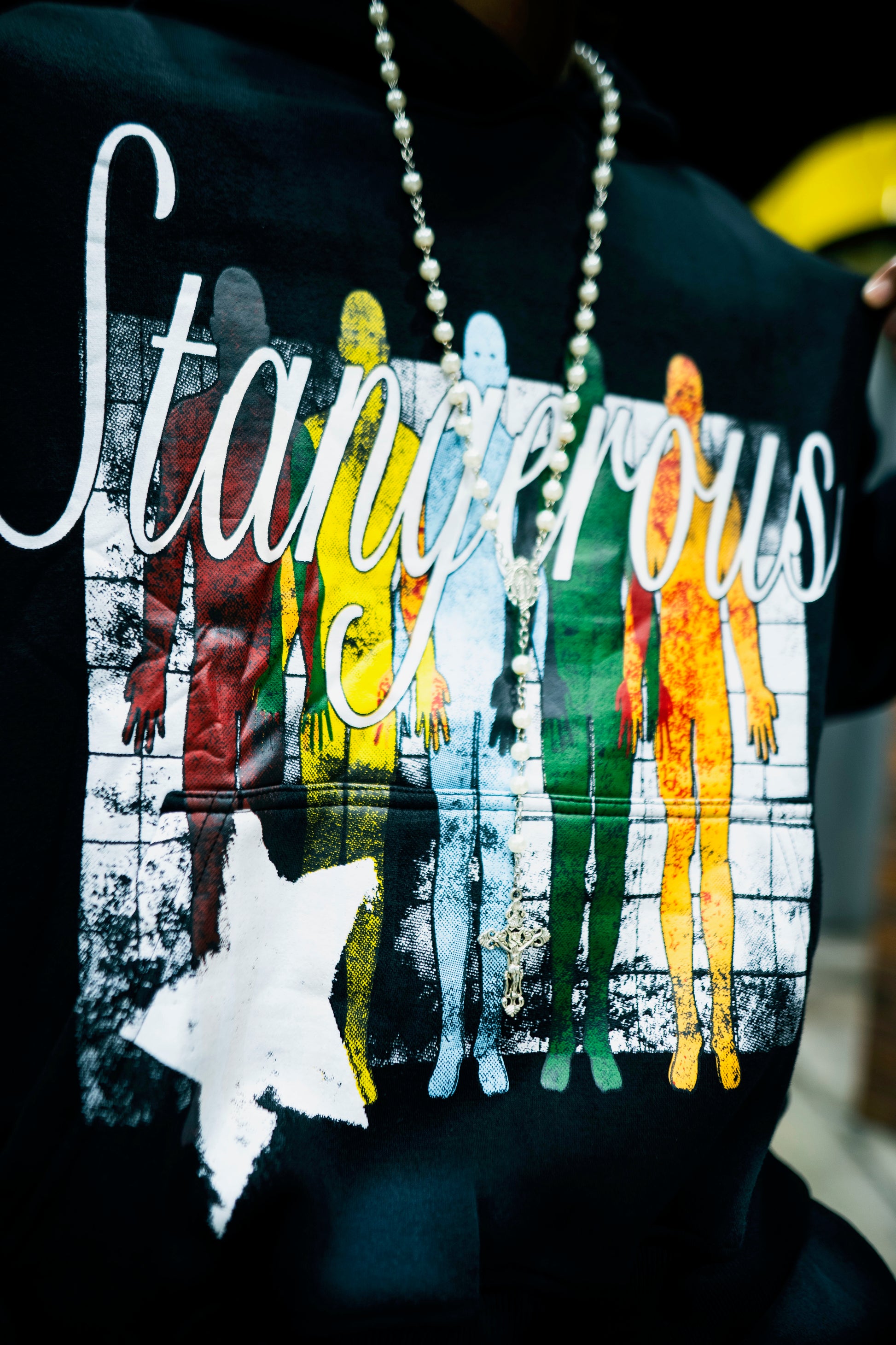 - Bold Clone graphic on hoodie